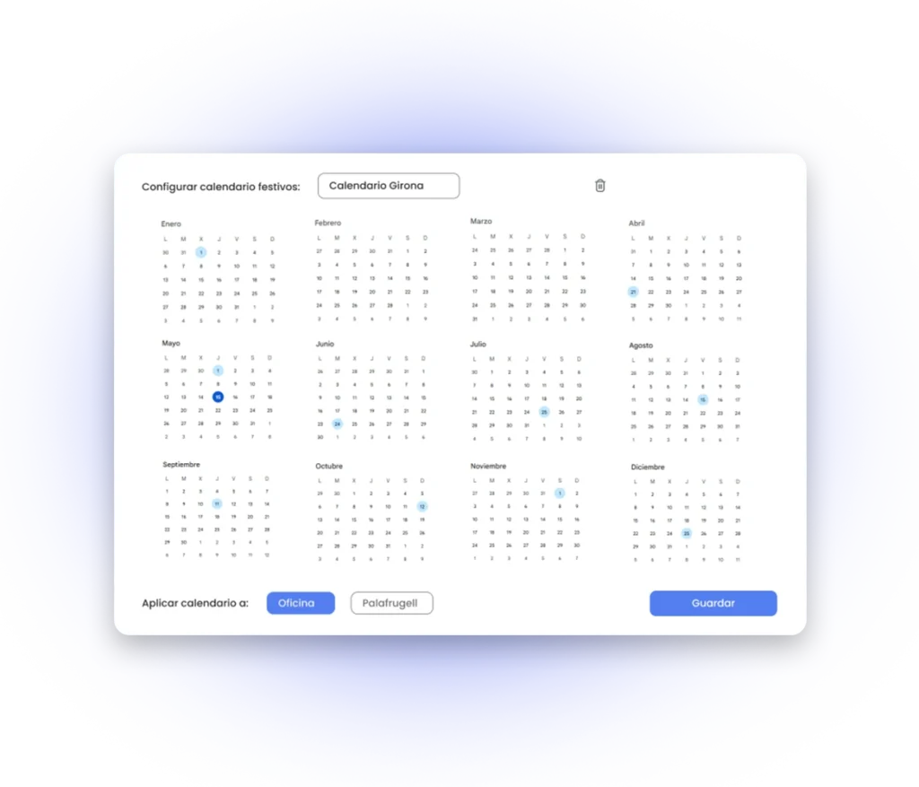 Desde nuestra app de control horario puedes configurar varios calendarios anuales de festivos de tu empresa y asignarlos a diferentes grupos de trabajadores. Si en tu empresa tenéis diferentes ubicaciones de trabajo, no tendrás ningun problema, es completamente personalizable el calendario anual.